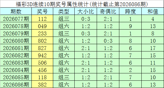 开奖回来:福彩3D第2026086期奖号为382。奖号情势为组六,大小情势为小大小,奇偶情势为奇偶偶,和值为13,跨度为6。