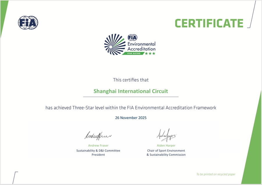 值得一提的是,上海海外赛车场近期以高分通过FIA赛谈环境三星认证。这标记着上海海外赛车场在环境科罚体系方面已达到海外高法度“最好试验(Best Practice)”级别,为将来经办海外顶级赛事及完了可捏续发展奠定了坚实基础。