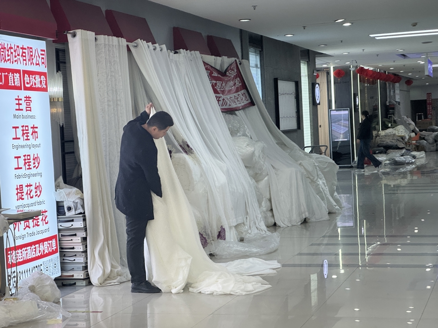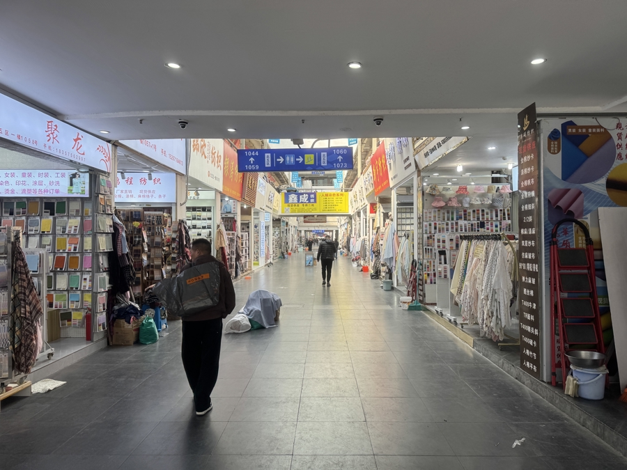 左近中午饭点,商场里的东说念主流量不算相等大,然则仍能见到不少采购商穿梭在这个迷宫般的强大空间中。他们走出一家店铺后,顷刻间又拐入另一家,不雅察和摩挲着各色布料,时常向店内的雇主询价。雇主们则弘扬出一种独到的镇定:既不淡薄,又不外分眷注,关于客商提议的各种问题,老是以最节略的措辞加以恢复。