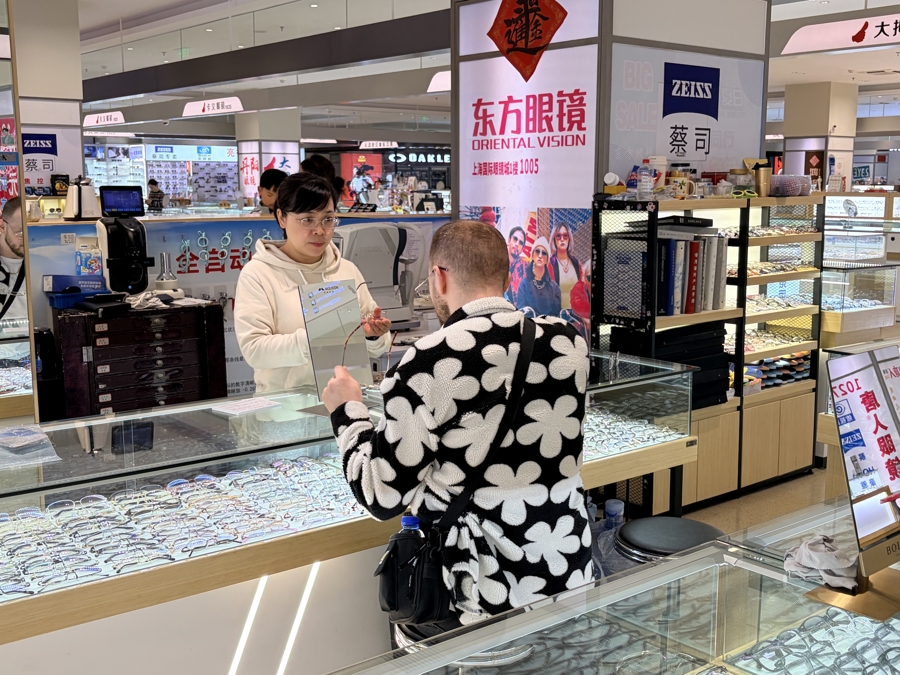 一位外籍旅客正在挑选眼镜(牛益彤 摄)