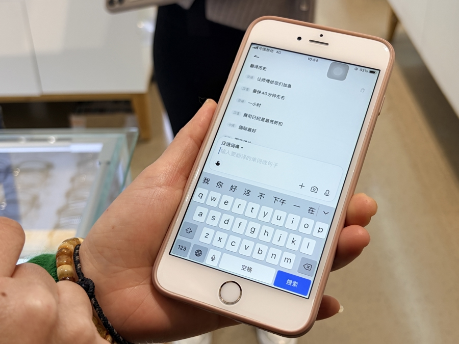 一位店主展示我方的翻译软件,基本齐是眼镜专科术语(牛益彤 摄)