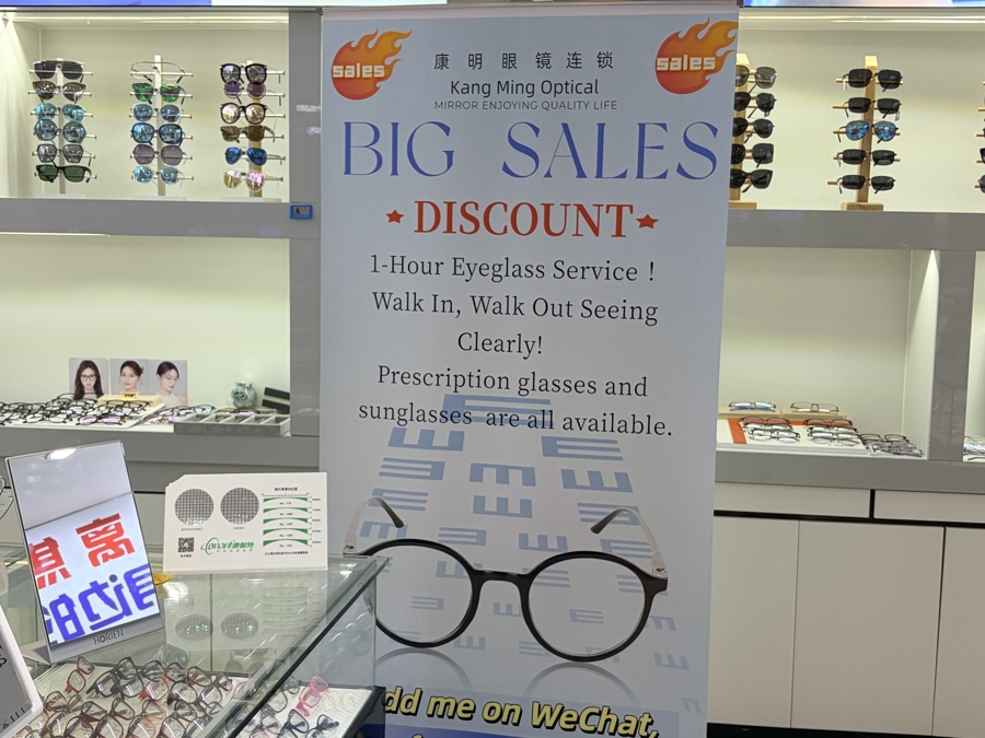 一家眼镜店内增设的英文标志(牛益彤 摄)