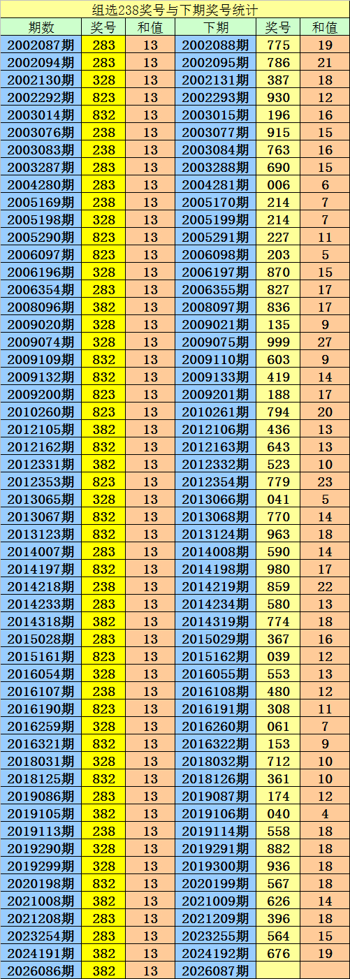 第2026086期3D奖号组选为:238,历史上该号码组选出现54次,下期号码分辨为:775、786、387、930、196、915、763、690、006、214、214、227、203、870、827、836、135、999、603、419、188、794、436、643、523、779、041、770、963、590、980、859、580、774、367、039、553、480、308、061、153、712、361、174、040、558、882、936、567、626、396、564、676。