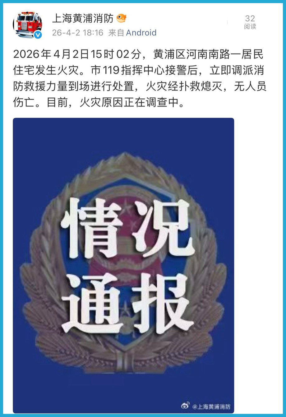 今天(4.2)下昼3时02分许,黄浦区河南南路398弄太阳齐市花圃小区南区一住户家发生失火,消防部门到场料理,失火未形成东说念主员伤一火。