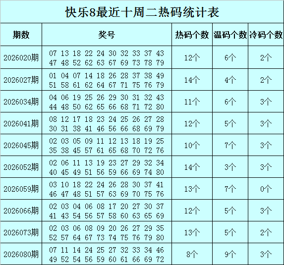 福彩得志8第2026080期(上周二)开奖回来:07 11 14 24 25 27 32 33 34 46 49 52 54 56 59 60 61 66 69 72,其中奖号遗漏总值为60,冷温热码比为3:9:8。