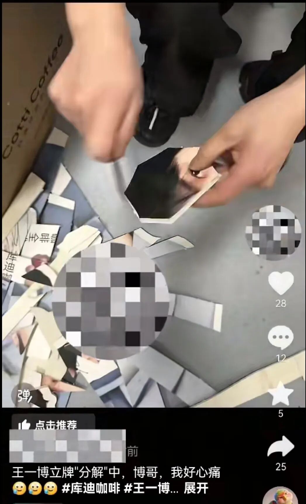 2月27日,库迪咖啡与王一博协作到期,有门伙计工在处理物料时,聚焦王一博肖像头部进行编著、离散,并将过程拍摄上传至叮咛平台。